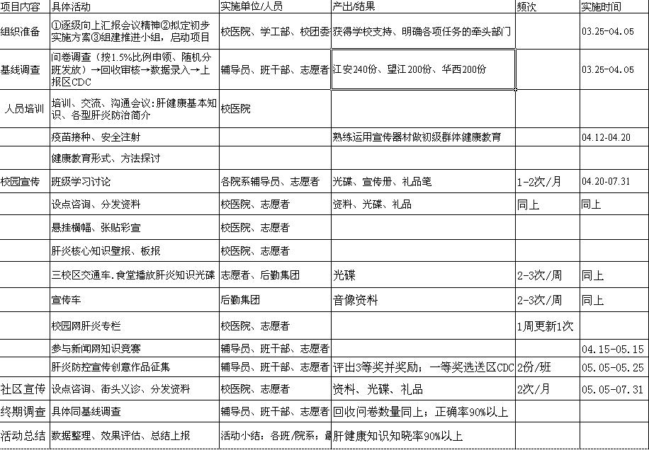 ① 征集大学生宣传肝炎科普知识的创意,每班至少2份作品,学校自评一二三等奖进行表彰;