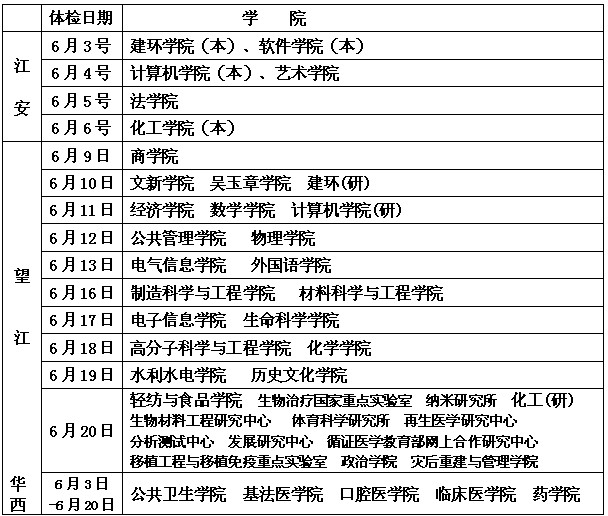 2、 望江校区、江安校区、华西校区各学院请依照规定时间体检,未标注“研”、“本”者含该学院全体毕业生