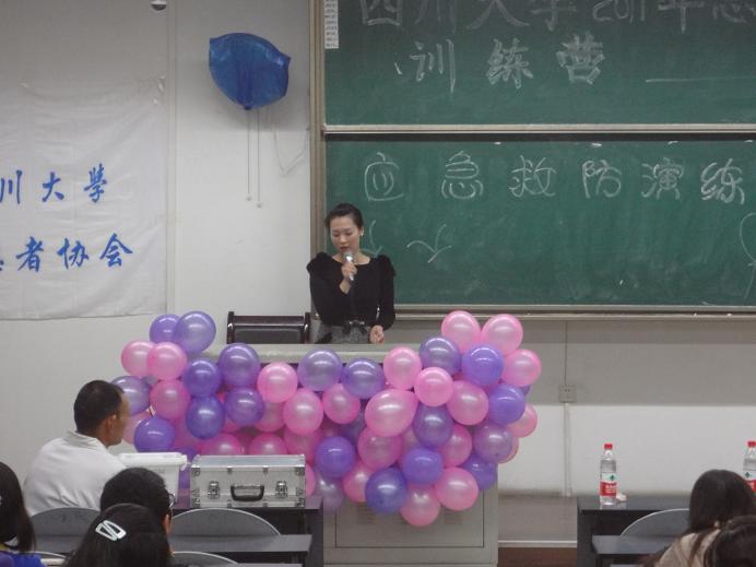 2011年11月3日《四川大学志愿者训练营活动—应急救防演练培训》在江安校区举行,江安医院文静科主任及杨小英护士长在现场给志愿者们进行了现场急救知识培训,文静主任等从现场急救的目的、意义、原则、步骤、注意事项等几个方面给志愿者们做了精彩讲述,并重点给大家培训了心肺复苏术、创伤现场急救技术(包括止血、包扎、固定、转运)以及火灾现场急救等相关知识,志愿者们普遍反应获益非浅。